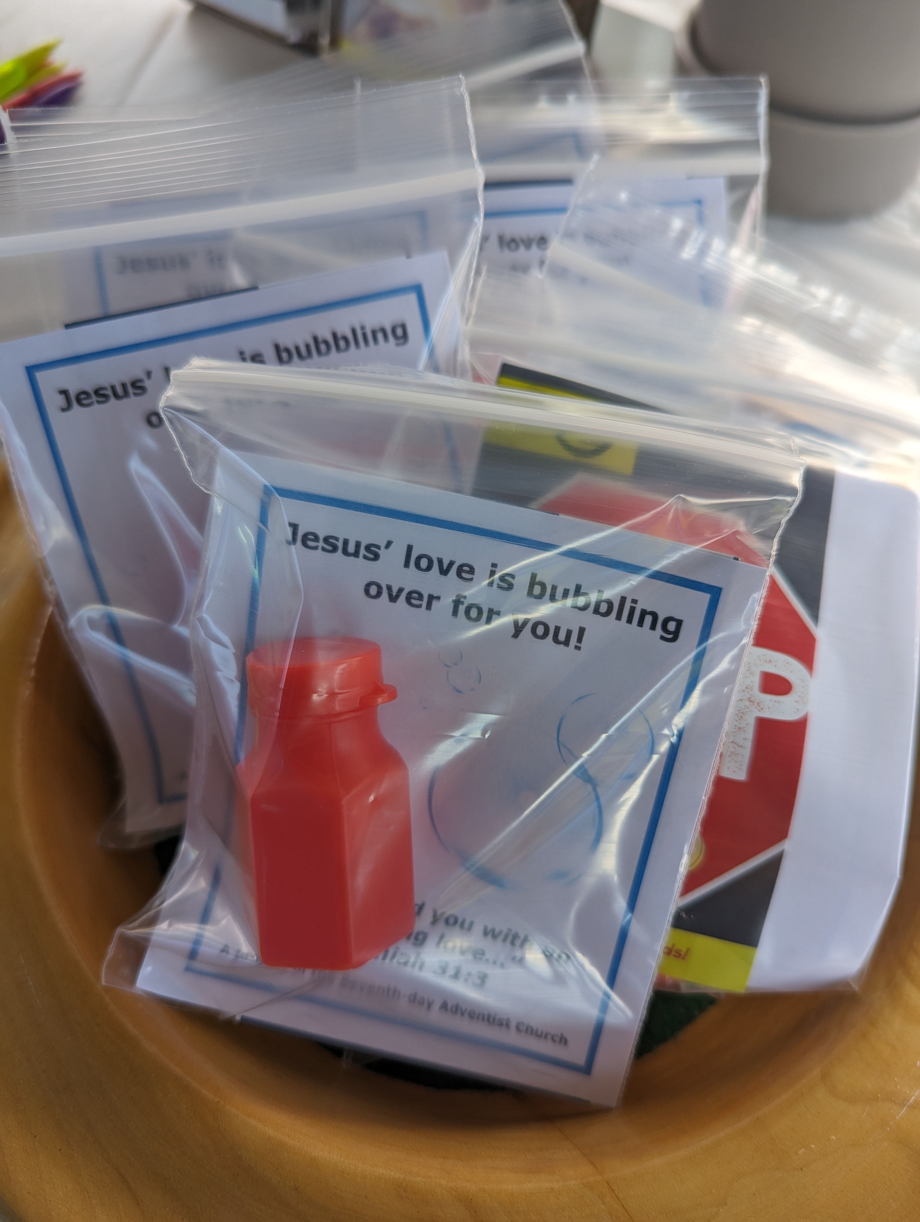 These bubbles were quite a draw! And once we started handing them out to kids instead of just leaving them on the table, we were able to talk with lots more people because we could share a bag of literature with the parents as well.